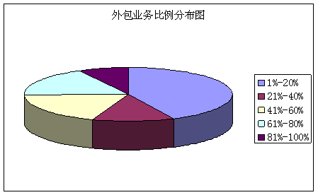 一、有29.4%的受访者表示,他们的呼叫中心目前有业务外包给第三方服务机构。但是绝大部分或者全部业务都依赖于外包机构的呼叫中心数量很少。在所有的利用外包服务机构的呼叫中心中,有42.9%的呼叫中心仅外包他们总体业务量的1%-20%;有12.7%的呼叫中心外包他们总体业务量的21%- 40%;有19%的呼叫中心表示他们的外包业务量占到总体业务量的41%- 60%;另有17.5% 的呼叫中心外包61%-80%;而仅有7.9%的呼叫中心外包了他们81%-100%的总体业务量。(见下图)