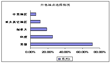 二、绝大多数有外包业务的受访呼叫中心把北美地区做为他们的首要外包选择地,71.4% 的呼叫中心选择了美国本土的外包商,19%的呼叫中心选择了位于加拿大的外包商。其它的外包选择地点还包括:印度(25.4%)、除印度外的其它亚太地区(11.1%)及中美洲地区(6.3%)。(见下图)
