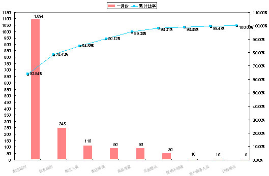 “图一”是一月份客户投诉的问题汇总,我们可以看到客户投诉了9个方面。不难发现,“配送超时”、“技术原因”及“配送人员”这三个方面累计的投诉数量占月总投诉量的85%。换句话说,如果我们从这三个方面入手,找到客户投诉的根本原因,并对症下药,我们可以避免此三方面的客户不满意。还有一点,不知你们是否发现,客户针对客户服务人员的投诉仅占总量的2%,其他都是针对公司其他部门的投诉,所以客户服务部门除为客户提供优质的服务的同时,也要充分扮演好客户在企业中的代言人的角色,即向相关部门及时反馈,并督促其改进。