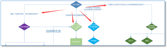 在视图中可以清晰看到在不同情况下的用户会接触到不同的渠道,有IVR自助服务的,有直接进入人工的,有通过微信客服的。如果你绘制的图足够大、细节足够清晰,你还会发现有部分用户会在不同渠道之间循环。举一个例子:为了提高自助服务的占比,我们制定的流程在人工话务环节增加了一个协同引导的动作,当用户接受后会进入到自助处理IVR流程,用户通过一系列处理后问题没有解决时会自动生成一张障碍工单,为了使工单下派时准确度更高一些,会补充进行人工回访进行二次预处理,这样用户又回到了人工环节(这些流程并不是同一时间设计的)(如图4)。