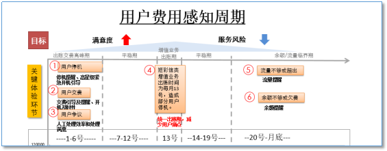 在图6,我们看到在月初要统一进行月服务费的收取,导致两个“痛点”,一是“用户停机”和“用户缴费”,但我们发现在月中的时候部分用户由于“增值业务”出账又被扣费,又有可能会造成停机,又会“痛”一次,所以根据原则三就能很容易得出结论,知道该如何改进。