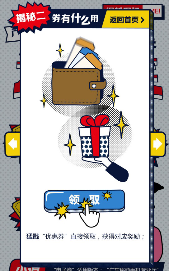 成功领取后客户可通过广东移动手机营业厅APP”首页-优惠券”(APP 5.1版本)直接免费兑换、享受券面折扣办理业务、在有效期内转赠他人(具体视营销活动配置情况)。如3元话费券,客户兑换后账户可直接获得3元话费;50M流量券,客户兑换后账户可直接免费获得50M流量。
