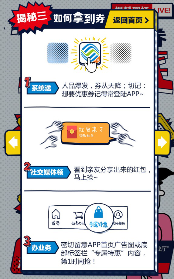 客户通过电子渠道办理充值或指定业务后基于客户行为分析,按照营销活动设定生成固定金额的话费券(不立即充入客户账户)或流量券,发放到客户个人APP账户“我的移动-优惠券”栏目下。