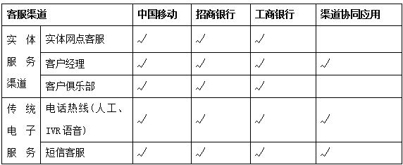 为提升客户服务能力、挖掘客户潜在价值,目前国内各行业均在客服协同应用方面进行了积极尝试与探索。为更好地探讨本行客服中心渠道协同应用思路,通过筛选,本文选取了目前国内在客户服务渠道上多元化建设及协同应用较为领先的三家标杆企业——中国移动、招商银行、工商银行,对其客户服务多渠道协同应用的具体发展情况进行了剖析(如表1)。