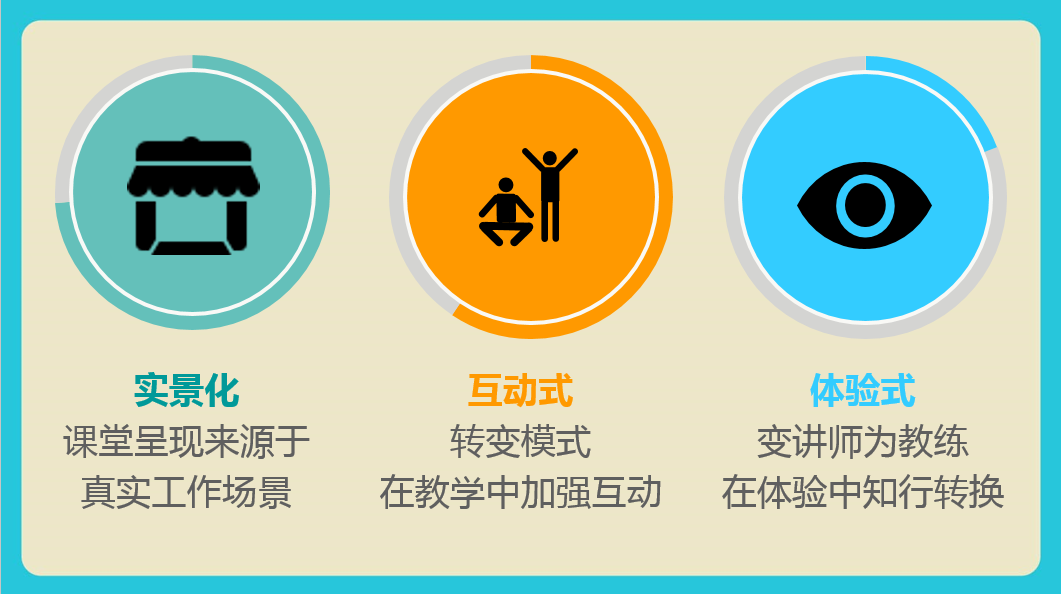 当学员处于注意力专区时(也就是受到足够和稳定的刺激时)会感觉很好,处在这样的身心放松状态中做事会很有效率,有足够的力气把事情完成,也会认真倾听,保持注意力集中,并最终完成教学任务,因此我们围绕注意力曲线模型进行教学设计,通过不断优化调整,最终形成了“实景化、互动式、体验式”的培训教学模式。