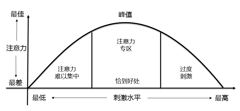 新教学模式的核心理论是注意力曲线模型,注意力曲线源自露西•乔•帕拉迪诺博士的研究分析。注意力和刺激之间的联系是理解注意力和学习如何控制注意力的核心,心理学专家用“刺激水平”来描述人感到无聊或兴奋的程度,“刺激”也被称作激活或驱动力。要理解注意力和刺激之间的关系,可以简单地画一个山形或者一个倒U形曲线。垂直的Y轴代表注意力。从上到下代表注意力由好到坏。水平的X轴代表受到的刺激水平,从左至右表明受刺激程度由低到高(如图2)。曲线的左端代表缺乏刺激,而曲线的右上端是过度刺激。在曲线的两端是处于缺乏刺激和过度刺激的状态,这时候的注意力水平是很低的。在曲线的中心区受到的刺激程度恰到好处,注意力处于最佳状态,这就是注意力专区。