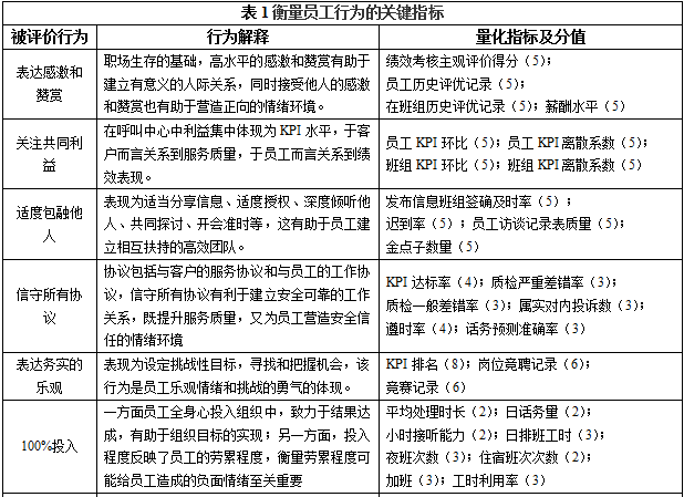 行为是情绪的直接表现,如何用可量化的数据做为行为的衡量标准是实现情绪管理系统化的关键,本系统对呼叫中心员工工作流程进行了全跟踪,从中提取出36个量化指标并将各指标与八种典型性行为进行逐项对应,如表1所示。