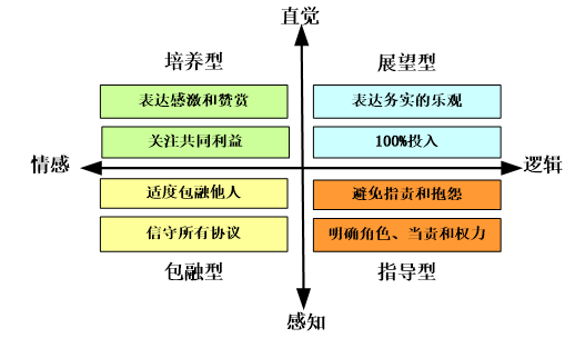 荣格理论将人的天性划分为四种:逻辑、情感、感知、直觉。每个维度对应员工的一种核心需求,以荣格理论为基础的坐标系被称为4D系统,如图2所示,基于四个维度将员工划分为培养型、展望型、包融型和指导型四类,同时借助八种典型性行为作为衡量方式,实现通过员工行为表现来衡量其情绪的目的。培养型员工需要被赞赏,典型性行为表现为表达感激和赞赏和关注共同利益;展望型员工需要充满希望的未来,典型性行为表现为表达务实的乐观和100%投入;包融型员工需要归属感,典型性行为表现为适度包融他人和信守所有协议;指导型员工需要获得成功的能力,典型性行为表现为避免指责和抱怨及明确角色、当责和权力。