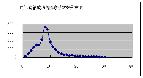 保险电话营销成功分布概率图如下,其中:横坐标为拨打电话的次数,纵坐标代表最终成交的保单数量。