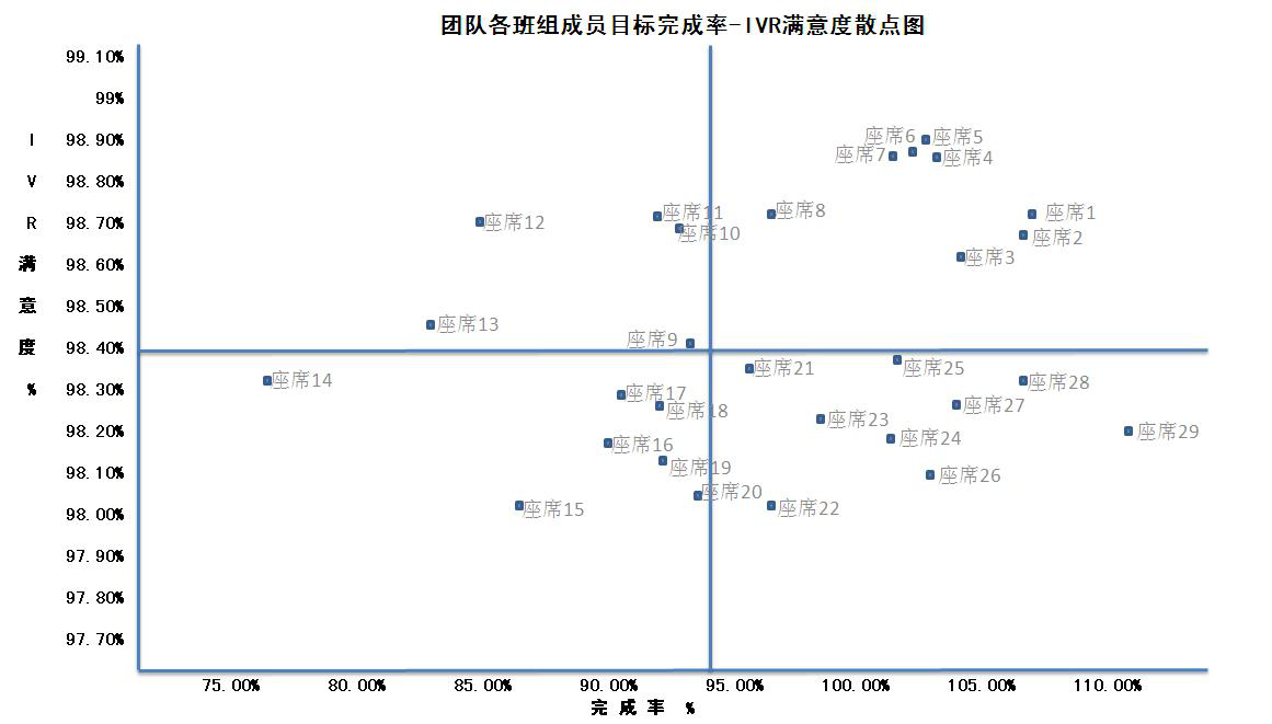 客服中心作为人员密集型中心,其绩效指标多,考核方式复杂,因此通常以月为周期发布绩效考核结果,如7月中旬才能看到6月的绩效成绩,滞后性明显,在这样的情况下团队和班组为了能够实时掌握人员绩效水平,通常以周为单位进行分析。因此找到一个准确边界的阶段性绩效分析工具尤为重要。笔者以常用的质效分析为切入点,结合“完成率-满意度”两项指标为例,使用象限图进行分析。