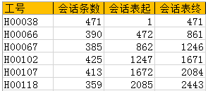 假设一个在线服务中心有200人,每人每天的业务量在200通左右,那么全天就有4万通的会话量,共有8万个时间点,若是直接对8万个时间点进行排序,其计算量非常恐怖,所以在计算时间点排序之前需要先按照员工工号、会话开始时间进行排序,如图2所示计算出每一位员工的会话条数、表格中会话的首条会话位置、末条会话位置等数据以缩减后续计算量。
