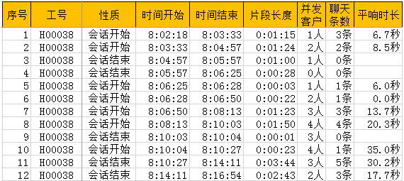 在线服务中客户与座席双方通过文字进行交流,客户每发出一条文字必然希望能够得到及时有效的回应,所以在线服务中有一个广泛使用的效能考核指标叫做平均响应时长,它反映的是座席员是否总是能够及时响应客户问询。平均响应时长的计算依据是座席与客户的多回合聊天记录,首先依据座席每一句聊天内容的抵达时间计算出这一句话的响应时长,进而将全部聊天内容的响应时长加总计算,得出全天、全月的平均响应时长。