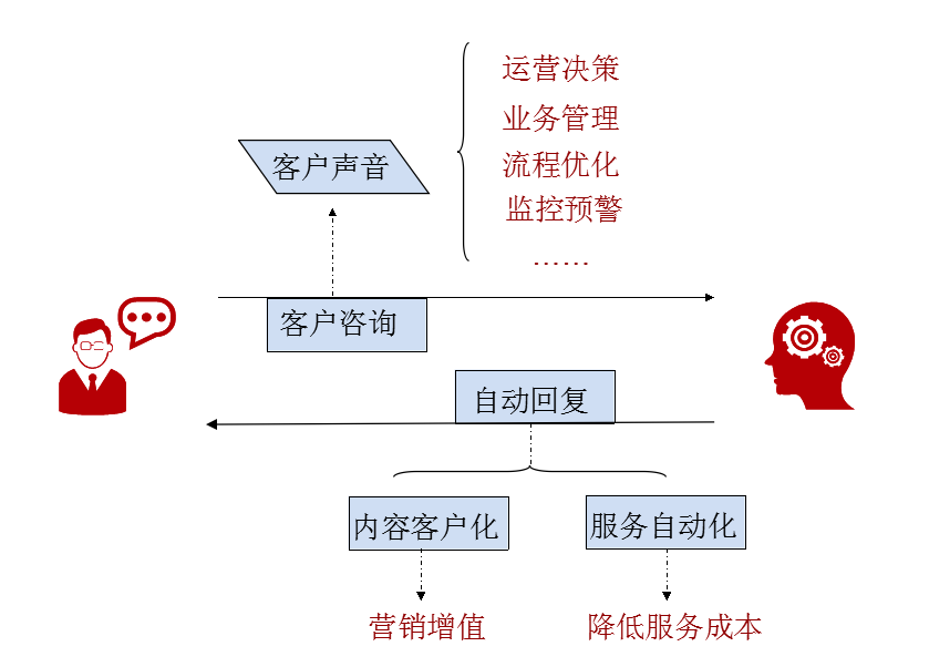 智能机器人可以应用在业务管理和流程优化上,通过分析的客户互动数据来拿到客户对于呼叫中心流程、服务上的意见或建议,这些数据在推动内部流程优化、提升客户服务体验工作上都是未失真的第一手资料,其价值显而易见。