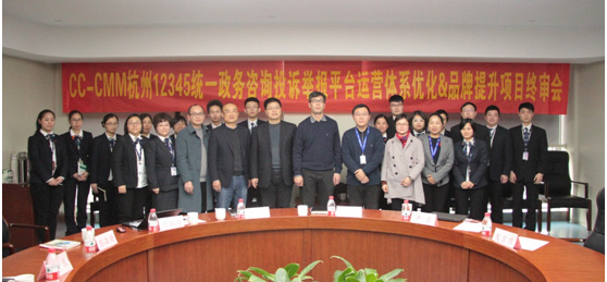 认证终审在杭州“12345”市长公开电话受理中心八楼会议室举行。CC-CMM国际标准组织执行理事葛舜卿,事业部总监严晶,杭州市信访局受理处副处长彭森荣,省号百事业部产品经理陈良玉、服务主管申翀,杭州分公司财务总监杨平良、号百事业部经理余海明以及12345热线运营中心核心管理团队出席终审报告会。