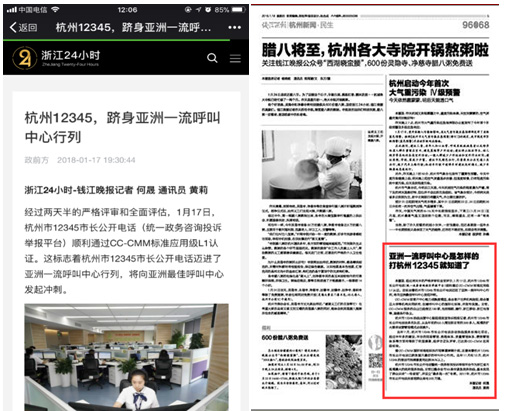 2018年1月17日,杭州 “12345”市长公开电话顺利通过CC-CMM客户中心成熟度模型应用级(L1)认证。目前,中国通过CC-CMM标准咨询认证的企业150家左右。在六个月的评审过程中,杭州“12345”基于基线评审六大改善领域的改进情况,始终按照更高标准——专业级(L2)持续提升和改善,经过CC-CMM国际标准组织从各个纬度的严格测评,最终顺利通过CC-CMM应用级(L1)认证。