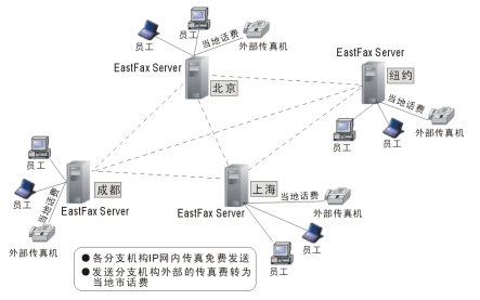 EastFax在国内首次应用中央服务器的方式管理整个集团的传真。改变以往各个服务器之间一一相连、繁琐相加的方式,每个服务器只需与中央服务器相连,即加入整个集团传真网络。