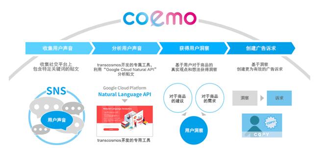 transcosmos集团(中文名:大宇宙集团;以下简称:transcosmos;总部:日本东京;总裁兼COO:奥田昌孝;东证代码:9715)发布独立开发的“coemo”服务,采用谷歌云AI解决方案之一的——“Google Cloud Natural Language API(谷歌云自然语言API)”,帮助企业从社交平台上实时获取消费者声音,挖掘用户洞察,开发符合消费者心声的广告诉求。