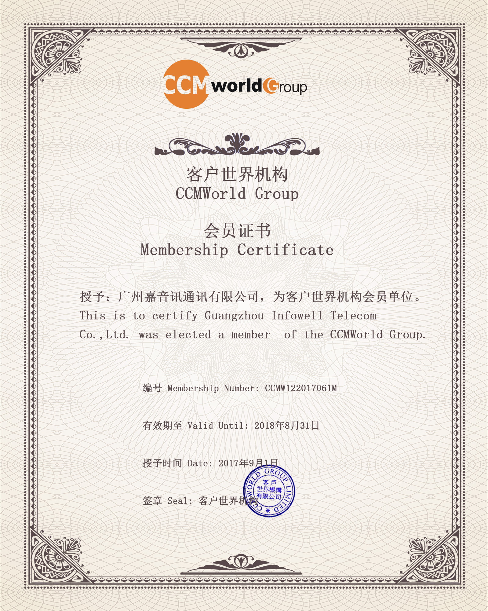 广州嘉音讯成为客户世界2018/2019企业会员