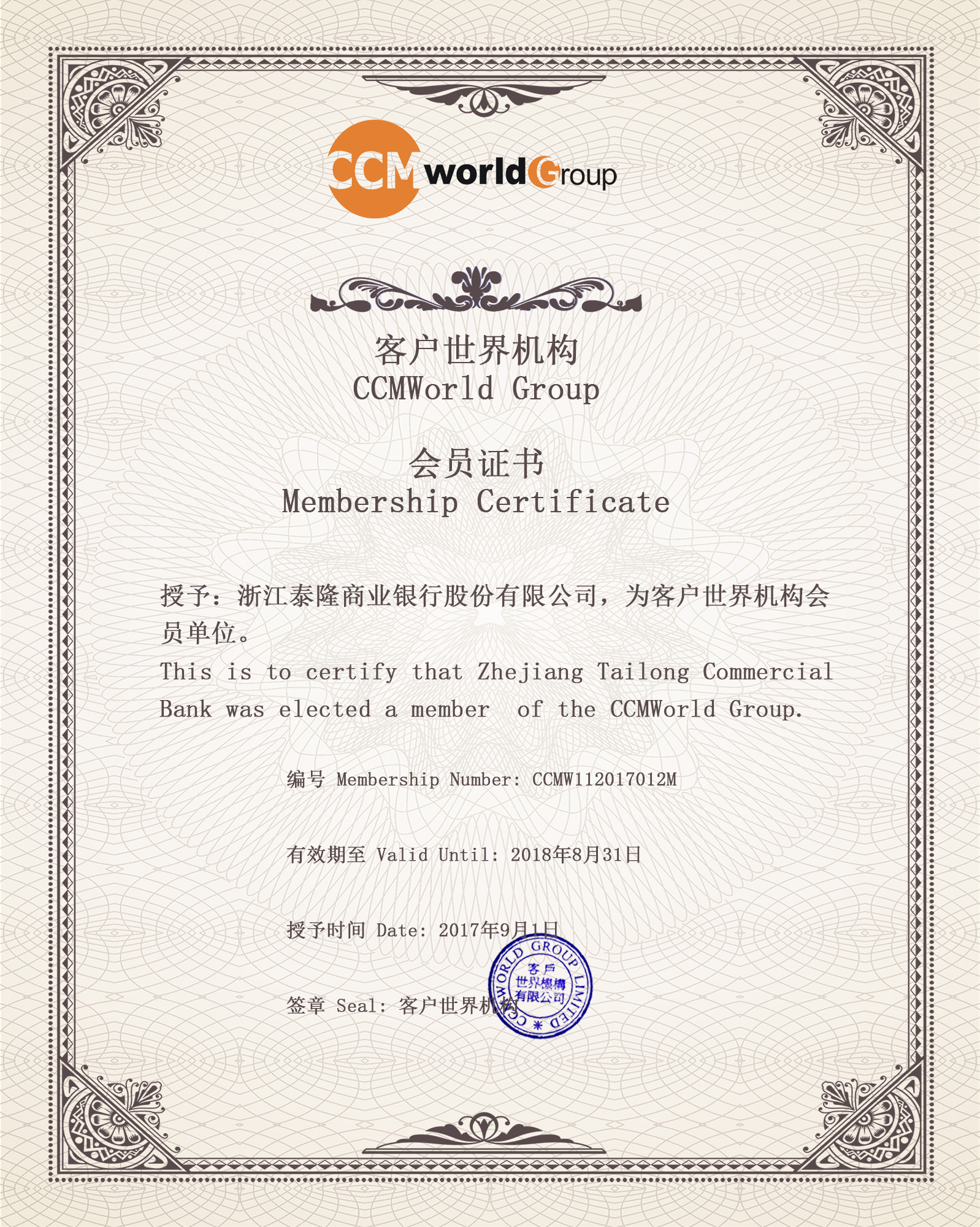 浙江泰隆商业银行成为客户世界2018/2019企业会员