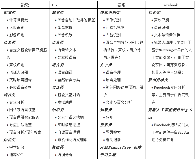 通过对这些IT巨头公司的研究,可以看到,微软开放了6大类25项API,IBM开放了7大类16项API,谷歌开放了4大类10余项API,Facebook开放2大类15项API(如表1)。