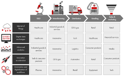 贝恩认为“数据、分析和连接”正重塑全球经济各个部分,预测未来数字化先行者将从物联、数据交易、高级分析、创新加速和工作流自动化等5方面进行商业过程颠覆(如图3):
