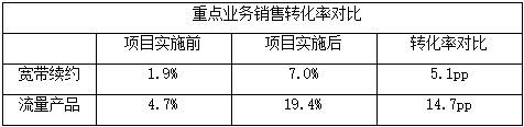 截至2017年8月,电渠4G套餐销量占比已达到31.29%(兄弟省市同期数据:北京15%),家宽销量占比已达到12.14%(兄弟省市同期数据:北京8%、浙江5%、江苏8%),分别较项目实施前提升7.03pp和6.45pp。