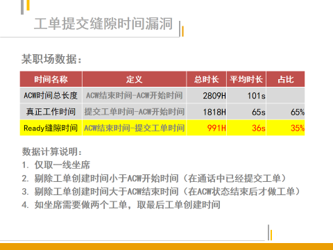 其一,是通过话务系统中员工状态变化表结合其他外部数据(比如需要工单流水表参与工单提交缝隙时间漏洞的计算)进行精细化分析计算,对员工每一次行为带来的时间碎片标记、修正并且汇总统计。