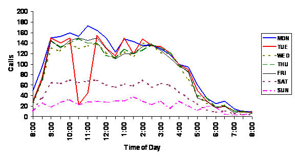 上面这张图表是一家银行的以半小时为间隔的一周业务量走势图。请注意在周二上午由于系统故障所造成的业务量急剧下降。这种超出常规趋势的意外情况常常与正常的业务量趋势格格不入。这说明了很重要的一点:意外情况引发的业务量数据变化在用作未来业务量预测的时候应该做适当的调整,否则将会严重影响到业务量预测的准确性。这种调整就是把意外情况时的数据调整到正常情况下的值,反映出如果意外没有发生的情况下的正常业务量趋势。