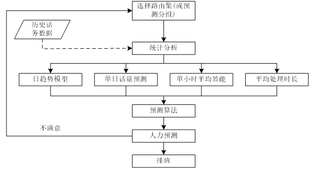 预测的主要目的是为预测分组维护相应的历史模型,即用于从历史话务数据预测得到当前业务所需要的座席人员数量模型。预测的基本步骤如下: