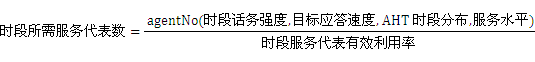 时段所需服务代表数= agentNo(时段话务强度,目标应答速度,日AHT*AHT时段分布,时段需达到的服务水平)/时段服务代表有效利用率