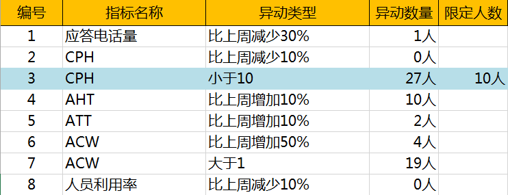 指标项“CPH”(每小时接听量)使用的是净值监控,只要员工CPH指标小于10,则立即体现在员工异动名单之中。但是本周CPH小于10的人员数量比预先设想的要多些,那么可以通过限定命中此项异动的人数上限来控制异动报警的数量。