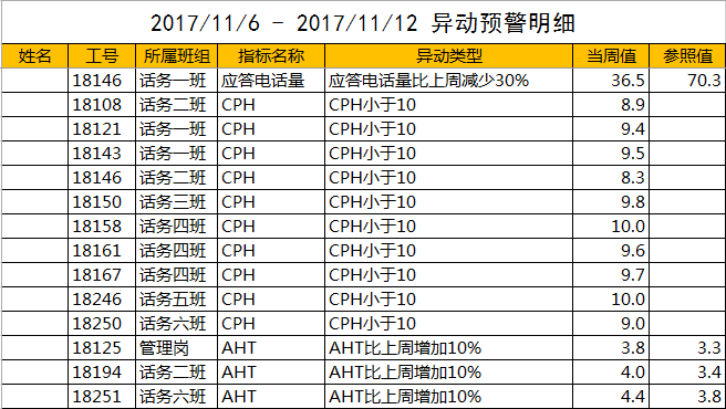 指标项“应答电话量”使用的是环比变化监控方式,其异动类型为“比上周减少30%”,则只有当某位员工的应答电话量环比下降超过30%时,才会体现在异动名单之中。