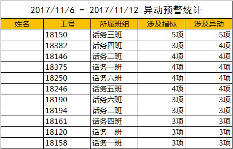 在异动预警明细的基础上,异动监控工具还能够根据员工工号汇聚异动预警涉及的指标数量、预警数量,自动在异动预警统计页签降序展示。在本案中,可以看到话务三班的18150号员工有5项数据指标异常,很可能是她在工作、生活中遇到了一些问题,急需要班组长介入了解情况,甚至需要客户服务中心管理层的关心与帮助。