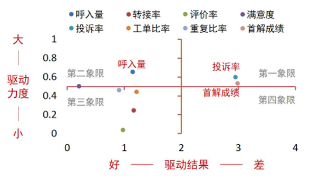在图4中以驱动结果为横坐标轴、驱动力度为纵坐标轴绘制了八项核心数据指标的绩效驱动力监测结果,从图中可以看到投诉率、首解成绩处于绩效驱动力监测管理矩阵的第一象限,应当持续加强这两项绩效考核指标的管理与培训;呼入量、满意度处于绩效驱动力监测管理矩阵的第二象限,应当考虑弱化考核管理;其他数据指标处于绩效驱动力监测管理矩阵的第三象限,若是关键指标则可以保留较小的驱动力度,若非关键指标则可以考虑移出绩效考核方案;最后,没有指标处于绩效驱动力监测管理矩阵的第四象限,该绩效方案暂时没有亟待调整的重大问题。