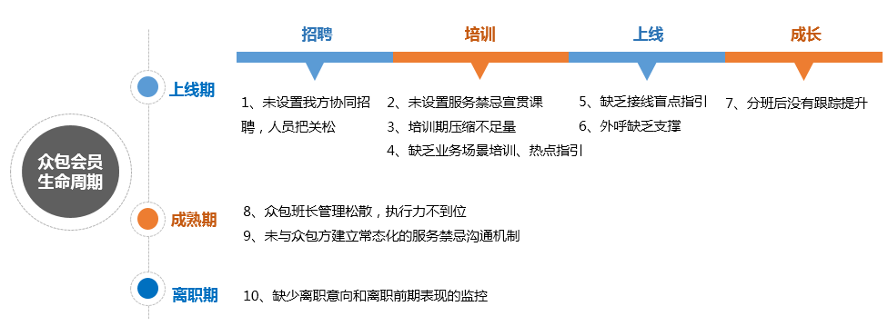 人员管控方面,根据全网服务禁忌通报,众包案例要显著高于自营,可见众包风险较高。防人在先,防众包先上加先,从众包会员上线-成熟-离职三大生命周期的关键节点深挖排查共发现10个不足点(如图1)。聚焦众包人员不同时期的问题点,通过“新会员强根基、成熟会员严督办、离职会员专看管”形成众包防控网,降低服务风险,提高众包人员服务水平,追赶自有员工。针对全量人员及四类重点关注的敏感小群体包括新晋人员、情绪人员、离职人员、违规人员来制定“思想根植—情绪提示—精神激励—监控预防—辅助支撑”的360度管控举措,提升人员的服务意识(如图2)。