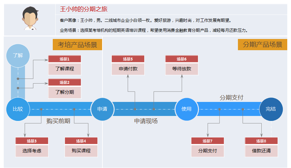 先看案例:王小帅同学感觉竞争压力大,工作上又需要使用外语,因此想在工作之余报个培训班好好补习一下,有可能的话再考个等级证,也好丰富一下资历,于是通过向同事了解、网上评价并多次到门店试听课程、了解产品价格及付款方式后采用消费分期的方式购买了3个月培训课程,学费分3期支付,3个月后学习完毕后分期也刚好结束,看似简单轻松的事情,王小帅却因为付款划扣的事所困扰,严重影响了对分期产品的体验并致电服务热线进行投诉,事后我们对整个服务过程进行复盘,找到了导致客户体验下降的几个触点问题。