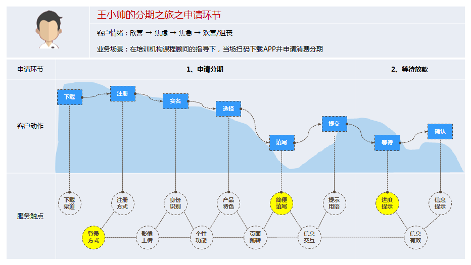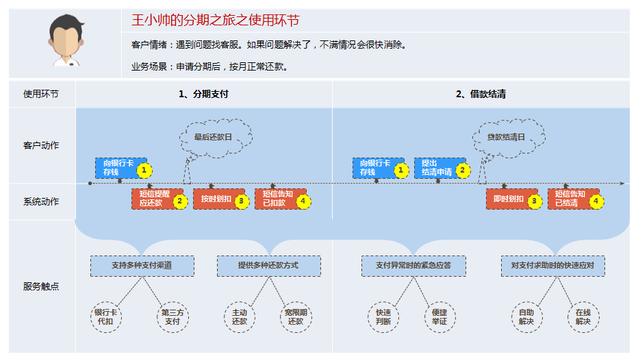 业务中经常让客户困扰的场景是申请现场与分期支付,这些业务场景中有大量的服务触点(业务环节中可以直接触达客户的场景及存在与客户交互的地方),客户在这些触点会产生大量对当前服务的体验感知,此处体验的好坏也决定着客户对产品的体验好坏。