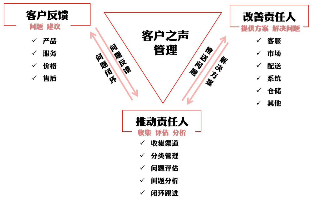 企业的VOC推动责任人对收集到的客户反馈进行分类整理,评估和分析其问题点、价值、可行性及责任部门等,分发至改善责任人制定解决方案,利用客户之声(VOC)推动公司及合作部门改善对应的服务及产品,并适时与客户互动,沟通客户反馈问题的改善进程。