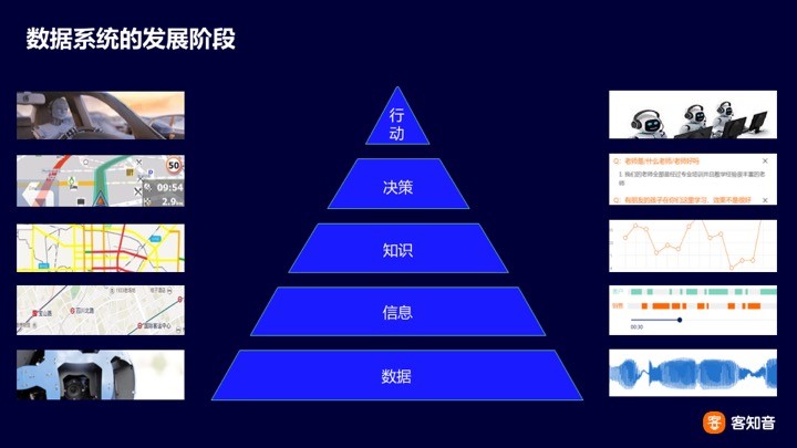 数据、信息、知识、决策、行动是数据系统发展的几个重要阶段,也是一个递进关系。数据就是我们常说的0和1,是对物理世界的客观表现。信息是融合了更多上下文的数据,知识是信息中蕴含的规律,决策告诉你应该怎么做,而行动是决策的执行。我们举一个地理位置系统中的例子,比如地图信息的采集,就是在数据层面;整理出来的地图包含地名和经纬度信息,在信息层面;根据用户上传的信息判断道路的拥堵情况,属于知识层面;大家开车用的地图导航,在每一个路口告诉你下一步往哪个方向走,是决策系统的功能;最后,自动驾驶汽车,就是一个终极的产品形态,因为它可以自动地把你从A点带到B点。
