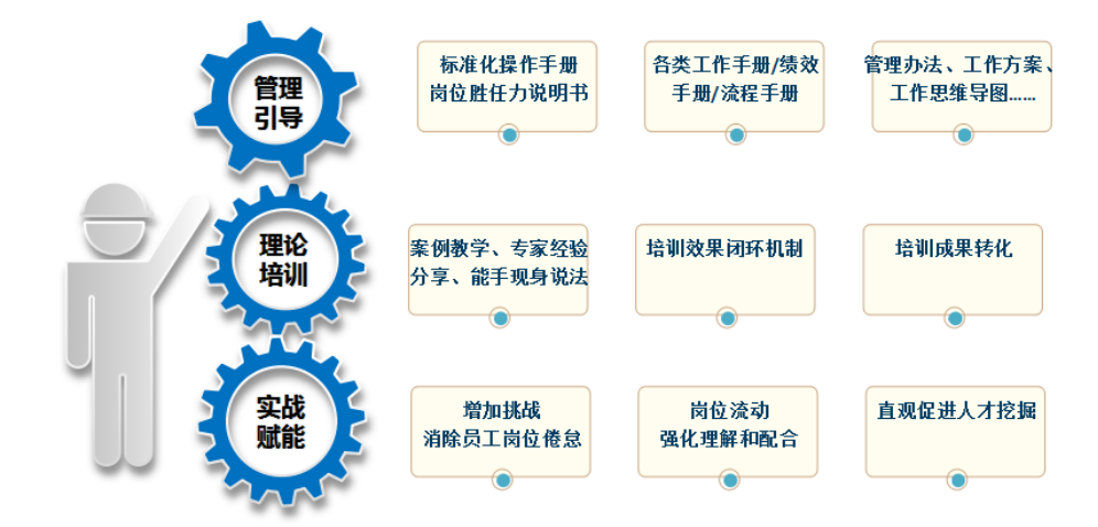 “理论培训”主要是通过各类具体的培训手段展开。培训要结合员工岗位成长需要、个人成长需要来科学设定,分对象、分阶段有序进行,通过“赋能培训”实现思路和方法的有效传导,通过案例教学、专家经验分享、能手现身说法等行之有效的方式来增强培训的情景。除此之外,同一门课程还应该是延续性的,需要建立起培训课程的“效果闭环机制”,即当初培训对象是带着需求开始了这场培训课程,那么培训之后该名学员的问题是否得以解决,他在培训后的应用中是否又有了新的困惑或想法,要通过课程的延续性来跟踪员工培训后的成长变化,实现事前、事中、事后的有机串联,以确保赋能课程的成果转化。