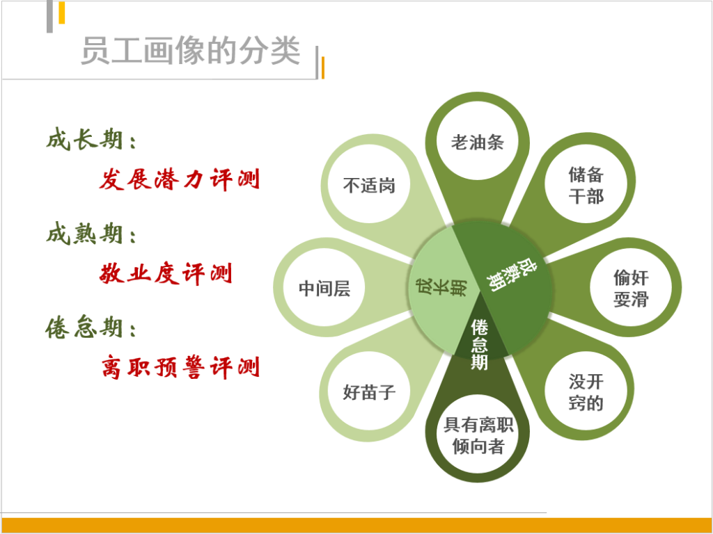 首先,员工成长期的发展潜力评测模型是依据最近半年入职员工的等职龄员工成绩构建样本库,用评测员工成绩在样本库基础上进行正态评分,从而了解到该员工在最近半年所有新人中的成绩水平,依据最终评测得分可以把员工分为“好苗子”、“中坚层”、“不适岗”三类,并且针对性地执行管理动作。