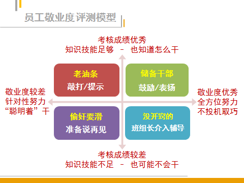 如图2所示,通过绩效成绩、敬业程度指标将员工区分为四个象限,即“储备干部”、“老油条”、“偷奸耍滑”、“没开窍”四类人群,然后针对性地开展管理帮扶。比如对于“老油条”类型的员工可以敲打提示,从他们身上挖掘投机取巧的办法,从而进一步堵住绩效考核的漏洞。对于“没开窍”的员工可以让班组长介入辅导,帮助他们快速成长。