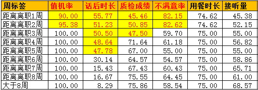 可以看到多项数据指标在离职前出现了变化,但发生数据变化的起点并不一样,这和员工在离职前的心态渐变有直接关系。在本案中员工在离职前五周话后处理时长就会出现下滑,这可以看做是最早期的离职预警指标,另外员工在离职前三周质检成绩出现下滑,在离职前两周值机率、不满意率会出现下滑,而用餐时长、接听量指标的变化并不明显。