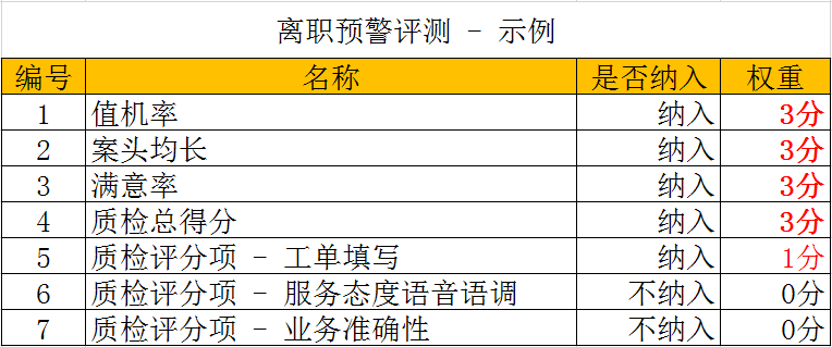 一般情况下在员工离职前很多需要付出巨大努力的服务型指标会出现下滑,如客户满意度、接听量;而更多依靠职业习惯的技能型指标不会出现下滑,如回答准确率、首次来电解决率。然而服务型指标往往会受到外部因素影响从而严重影响离职预警的质量,比如若因产品或流程异常导致客户满意度集体下滑,同时总体来电量减少导致人均接听量下降,这并不意味着很多员工都要离职,所以还需要剔除外部因素导致的数据指标波动才能找到真正出现数据指标下滑的员工。