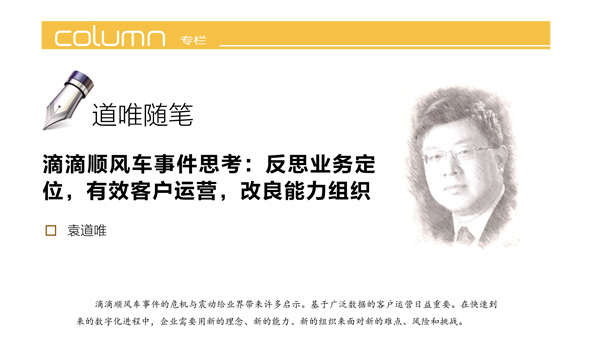 滴滴顺风车事件的危机与震动给业界带来许多启示。基于广泛数据的客户运营日益重要。在快速到来的数字化进程中,企业需要用新的理念、新的能力、新的组织来面对新的难点、风险和挑战。