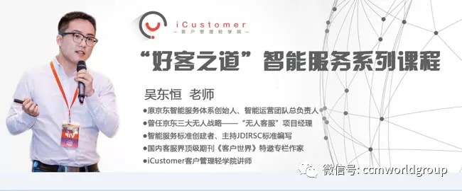 《智能服务》在线系列课程由客户世界机构旗下流媒体平台“iCustomer 客户管理轻学院”推出,我们特别邀请了业界知名的智能服务专家、原京东智能服务体系创始人、智能运营团队总负责人吴东恒老师进行本系列课程的讲授及课后答疑。
