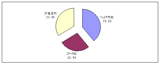 2006年国内传统电信运营商已经逐步开始进入到NGN及新一代VoIP业务的实质性网络建设阶段,并且随着企业对VoIP理解的加深及控制成本的考虑,大型企业CIO对VoIP的接纳态度正在向好。在中小型企业市场,由于企业对通信成本更加敏感,但受VoIP设备技术成熟及价格下降这些因素的影响,这一市场也在迅速升温。这些都促使VoIP设备在2006年开始进入实际购买阶段,促进了VoIP设备规模增长。2006年第二季度国内VoIP设备市场收入为6.79 亿人民币,与第一季度同比增长率为19.96%,整体市场保持稳定增长。从中国VoIP设备产品市场结构(销售额划分)来看,VoIP网关占39.2%,IP-PBX占26.9%,IP电话机占33.9%。