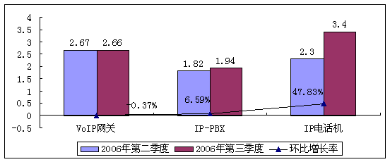 目前由于政策方面的原因,在中国涉及到PSTN的VoIP仍然是灰色地带,属于地下行为,因此中国VoIP设备市场仍然只是进入初步发展阶段,整体市场保持稳定增张态势,赛迪顾问预计2006年第三季度我国VoIP设备市场总体上仍将保持稳定增长,不会出现大起大落的局面,2006年第三季度中国VoP设备市场总量将达到约8亿元人民币。