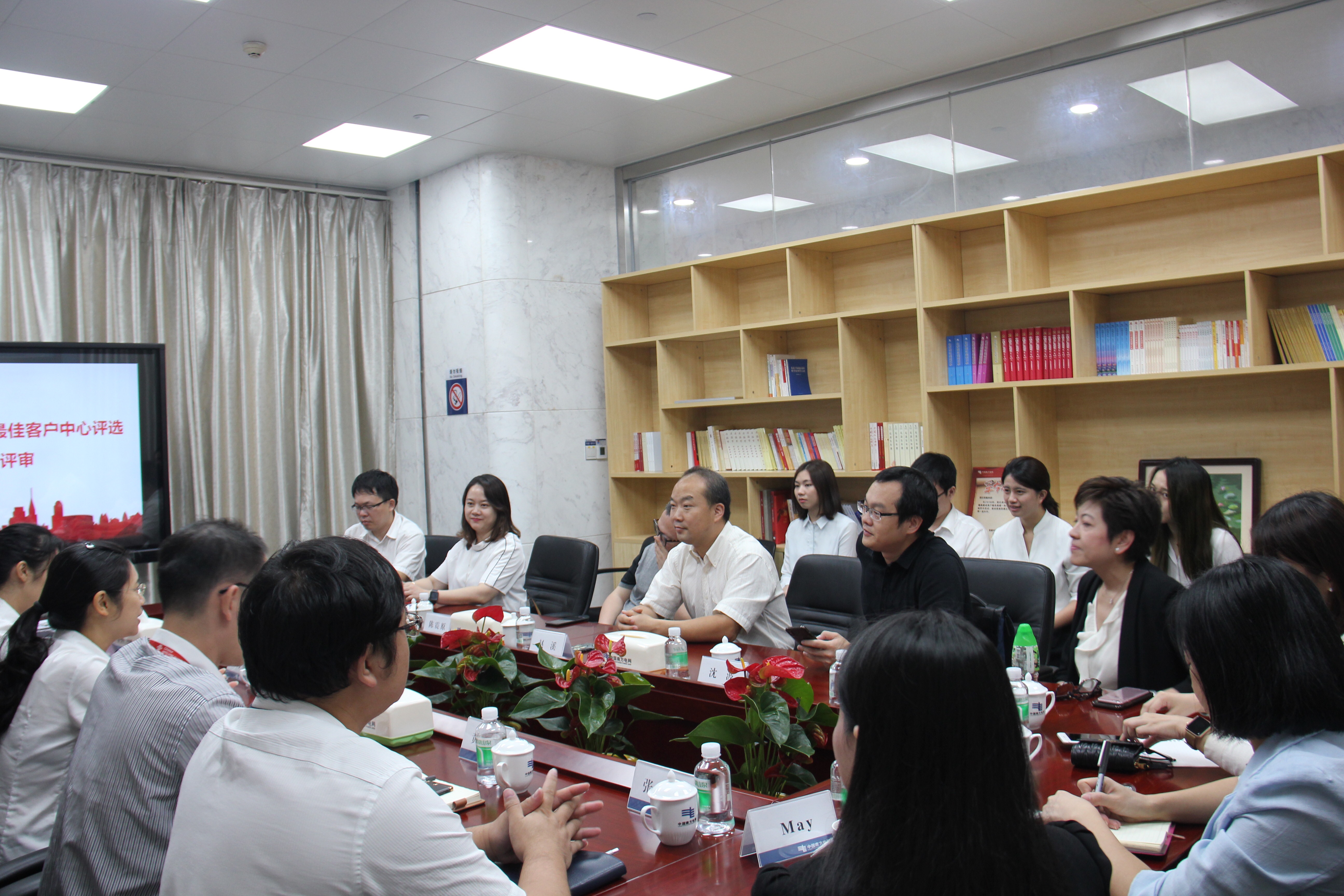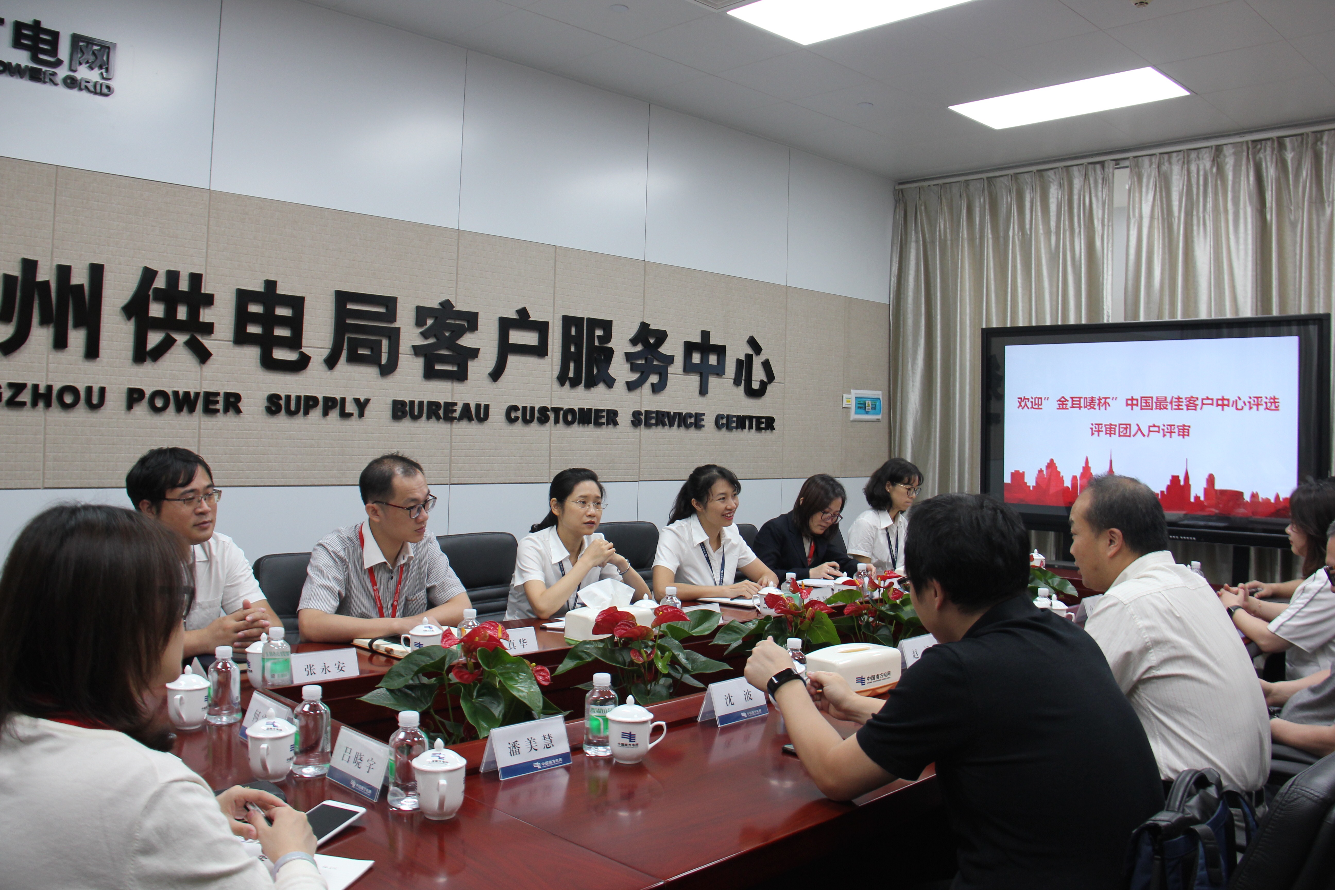 客户世界机构创办人赵溪,香港客户中心协会副主席、易宝国际集团总经理潘美慧(Joyce Poon), 广州服务贸易与服务外包行业协会呼叫中心与客户关系管理专委会主任陈震原,广州农村商业银行客户服务中心总经理卢洁凤,佰聆数据公司副总裁吕晓宇 ,中国电信广州分公司号百信息服务中心副总经理沈波,广东电网信息中心客户服务部部长黄锋涛,诚伯信息公司副总经理何雪芹,CC-CMM国际标准组织咨询顾问周桂梅。广州供电局客服中心副主任罗冠姗、95598呼叫中心主管殷秀颜等接待评审团考察,并就南方电网公司广州供电局有限公司客户服务中心95598呼叫中心的整体运营情况及运营管理特色进行了详细的介绍和充分的交流。