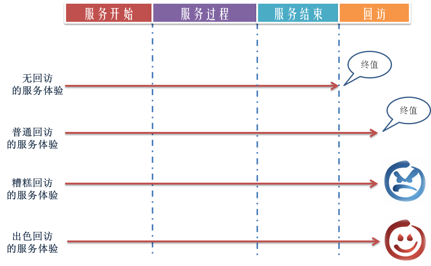 无回访的服务体验:客户的终值体验,取决于服务结束时的客户体验。由服务的主体提供者决定,如上门维修的工程师、快递员、接听电话的客服代表等。出于成本与实际意义的考虑,对于客户中心每天所服务的决大多数客户而言,他们体验的更多是这类服务。客户中心服务的关键,就是保证这个服务过程中的服务质量。